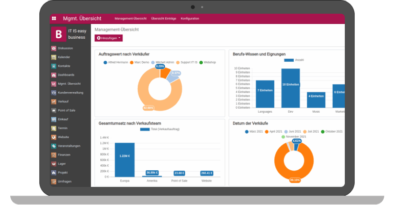 The management dashboard is complemented by the general Dashboard. Many views within ITISeasy.business are data views, known as Business Intelligence or BI views. Here, multiple data points are related and displayed in relation to each other over two axes. Whether it's sales over time, filtered or grouped by customers, or international shipment movements?