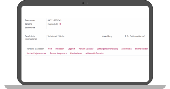 In the form view of a contact the following different fields can be inserted and changed:Char, Integer, Many2one, One2many, Many2manyIn addition the components Columns and Tabs can be added.